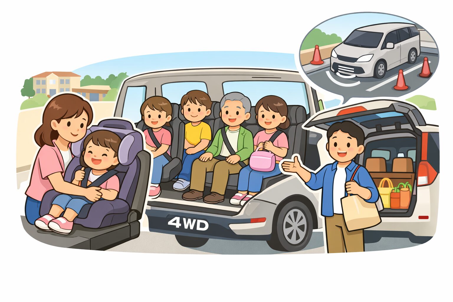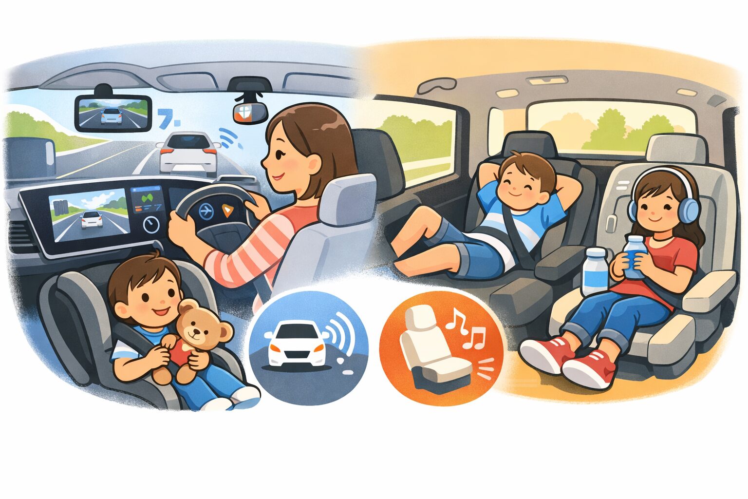 つまり、走りの楽しさというよりも、家族全員が気持ち悪くなりにくく、長時間でも疲れにくい移動空間として作り込まれている印象です。酔いやすい子どもがいるなら、ここはかなり注目したいポイントです。