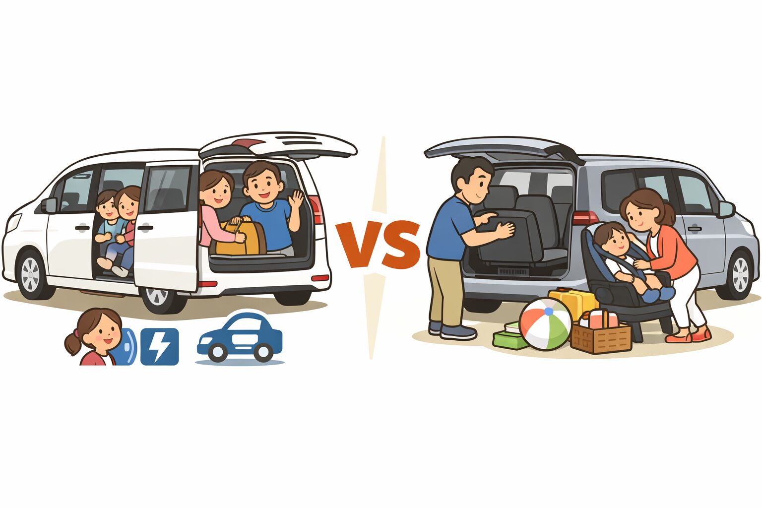 | 子育てとの相性 | ハンズフリーオートスライドドア、デュアルバックドア、後席リマインダーが便利 | 全列USB、トリプルゾーンエアコン、拭き取りやすい素材、2列目快適装備が便利 |