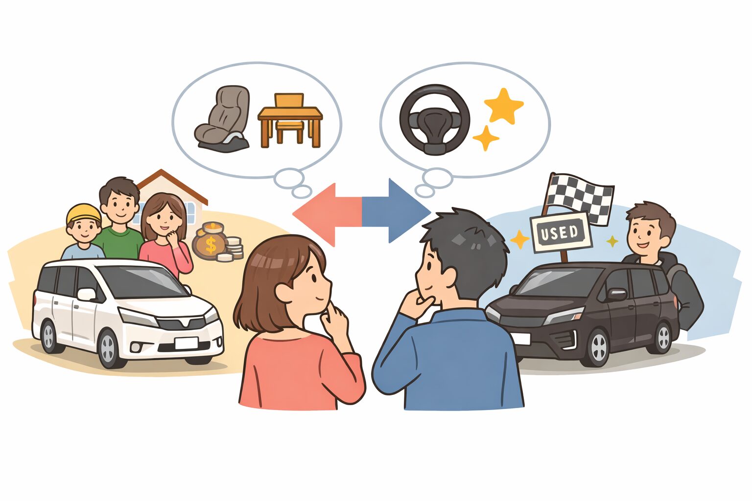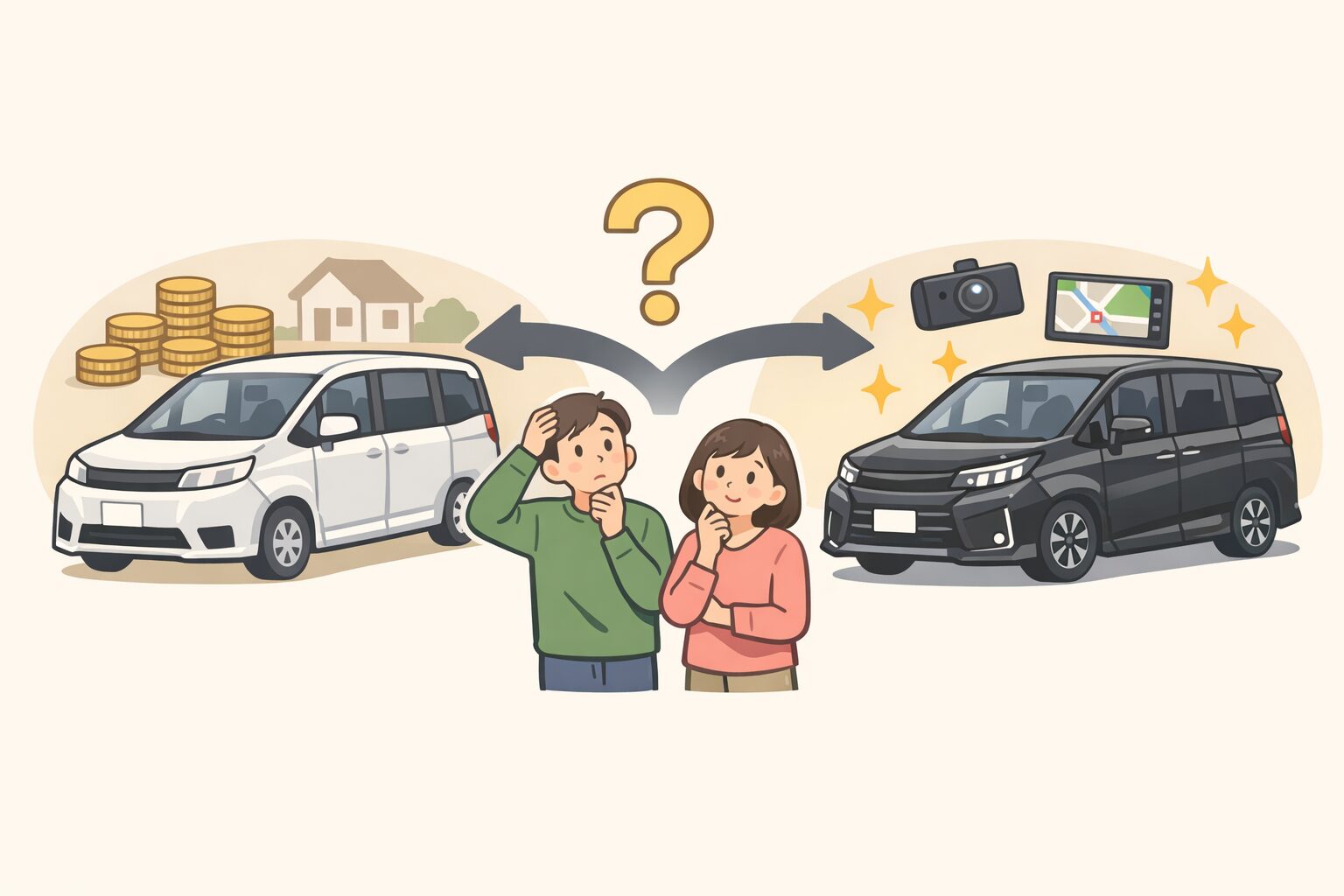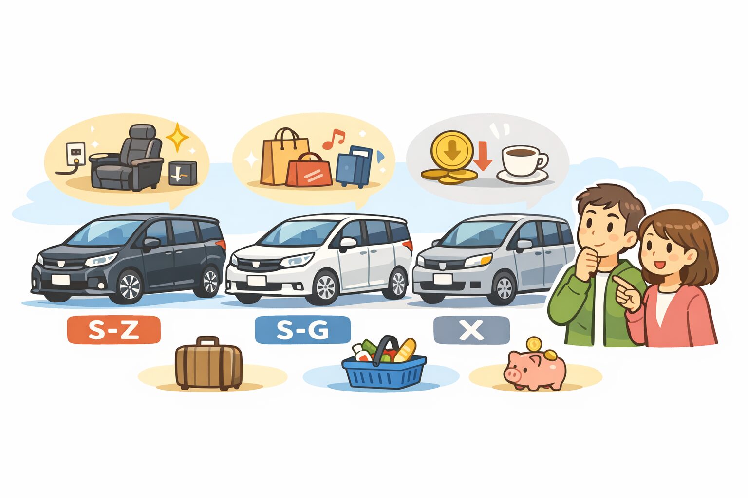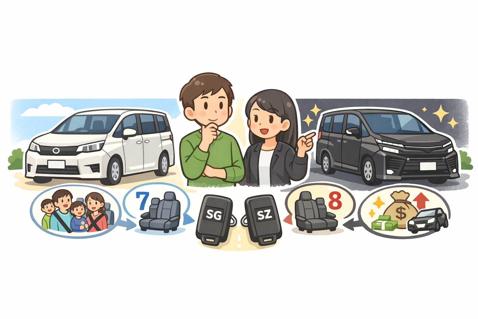 ただし、実際に満足度を左右しやすいのは「ノアかヴォクシーか」よりも、S-Gで足りるか、S-Zまで上げたいか。7人か8人か。この2点です。短時間で決めたいなら、まず人数とシート、次に予算、最後に顔つきの順で比べると迷いにくくなります。