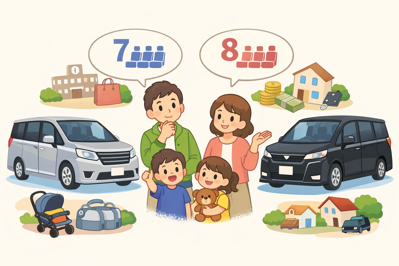 A. 広さはほぼ同じです。ボディサイズも室内サイズも共通なので、広さで決めるより7人/8人のシート構成で決めたほうが実用差を感じやすいです。
