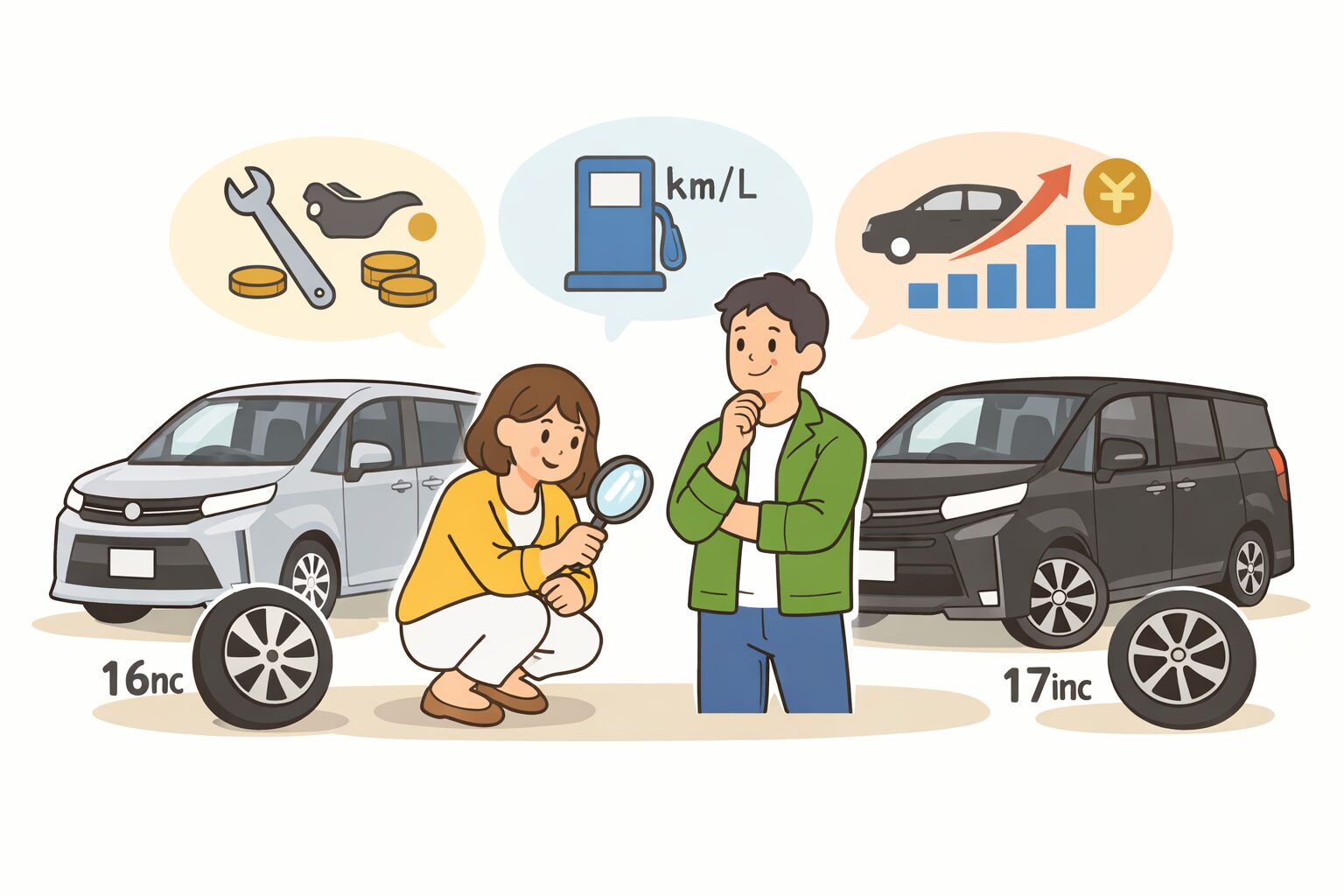 A. 同じハイブリッド同士、同じガソリン同士で比べればほぼ同じです。差が出やすいのはノア対ヴォクシーより、S-Zの17インチかS-Gの16インチか、ハイブリッドかガソリンかです。