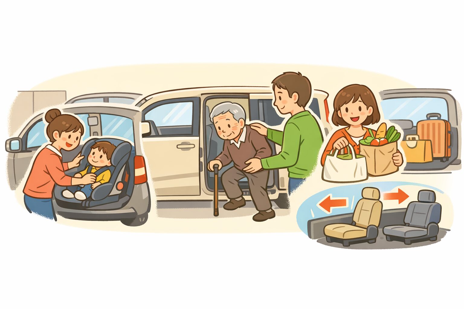 ヒンジドアの旧型では、隣の車が近い駐車場や壁際で後席ドアの開閉に気を遣いました。新型はそこが一番わかりやすく変わります。チャイルドシートへの乗せ降ろし、買い物袋を持ったままの乗り込み、高齢の家族の乗降補助など、後席を日常的に使う人ほど恩恵を感じやすいです。後席は左右分割ロングスライド240mmにも対応しており、足元と荷室の配分も調整しやすくなりました。