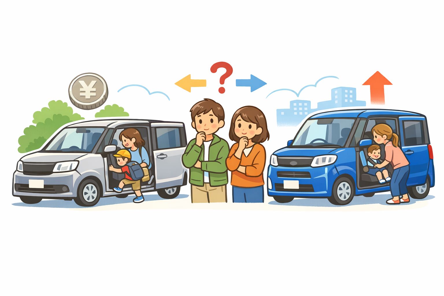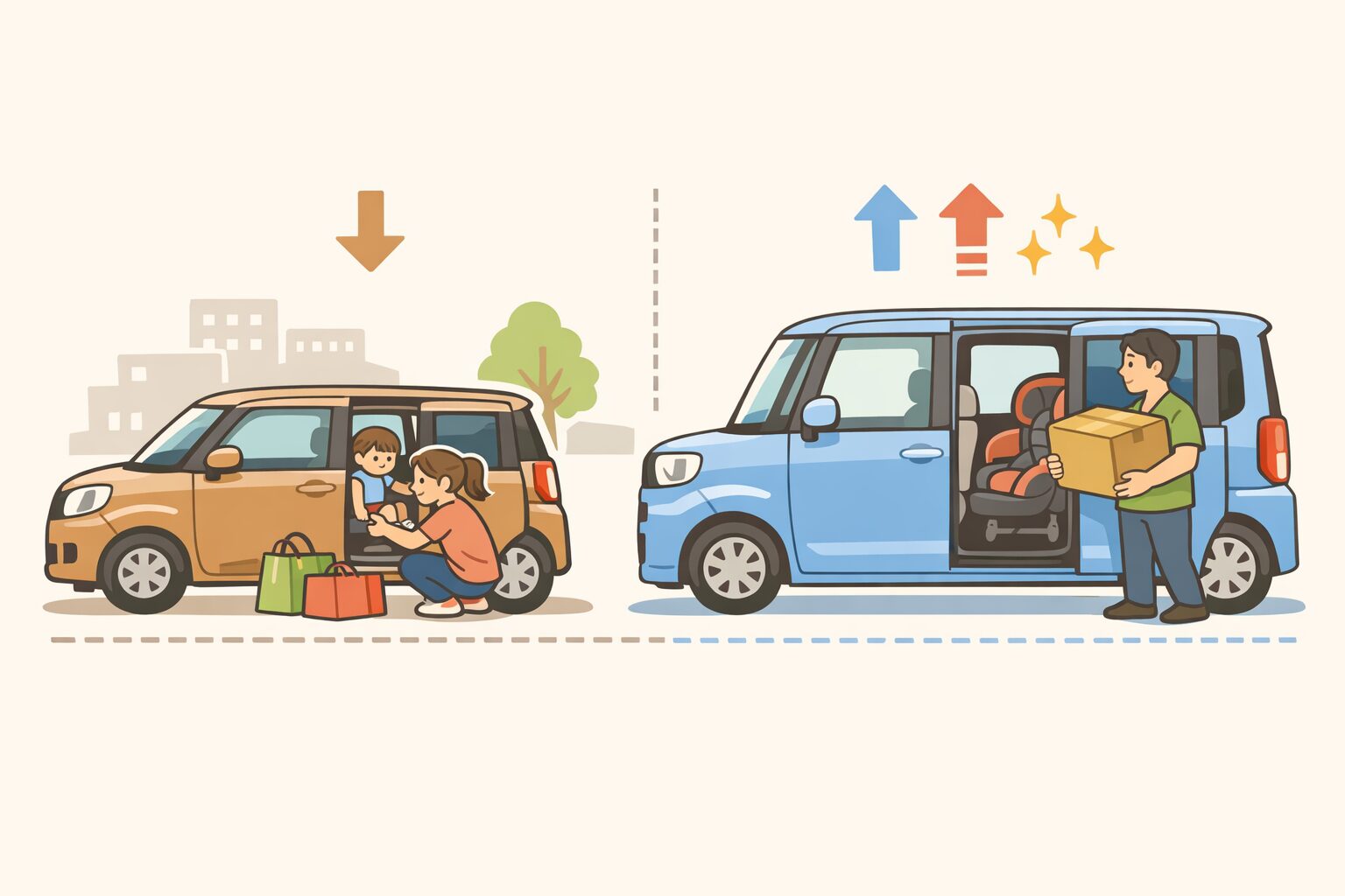 「スライドドアが欲しい」という意味ではかなり近づきました。ただし、タントの強みである100mm高い室内高とミラクルオープンドアによる大開口までは引き継いでいません。最大限の子育て実用性を求めるなら、タント比較は必須です。