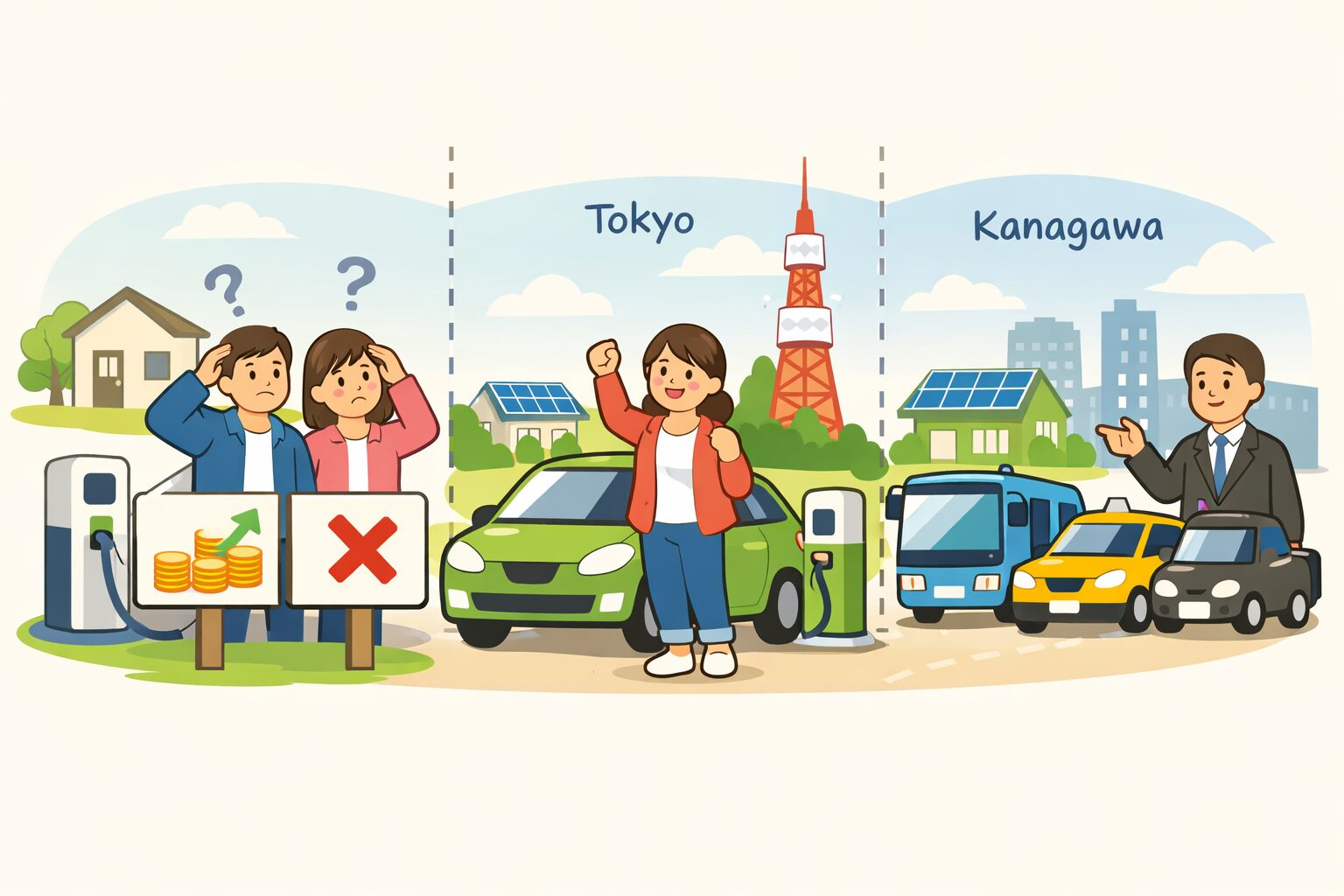 - 自治体補助は地域差が大きく、東京都は2026年度にEV最大100万円の制度を予定する一方、埼玉県は2026年度の実施予定なし、神奈川県は個人の自家用EV購入が対象外です。