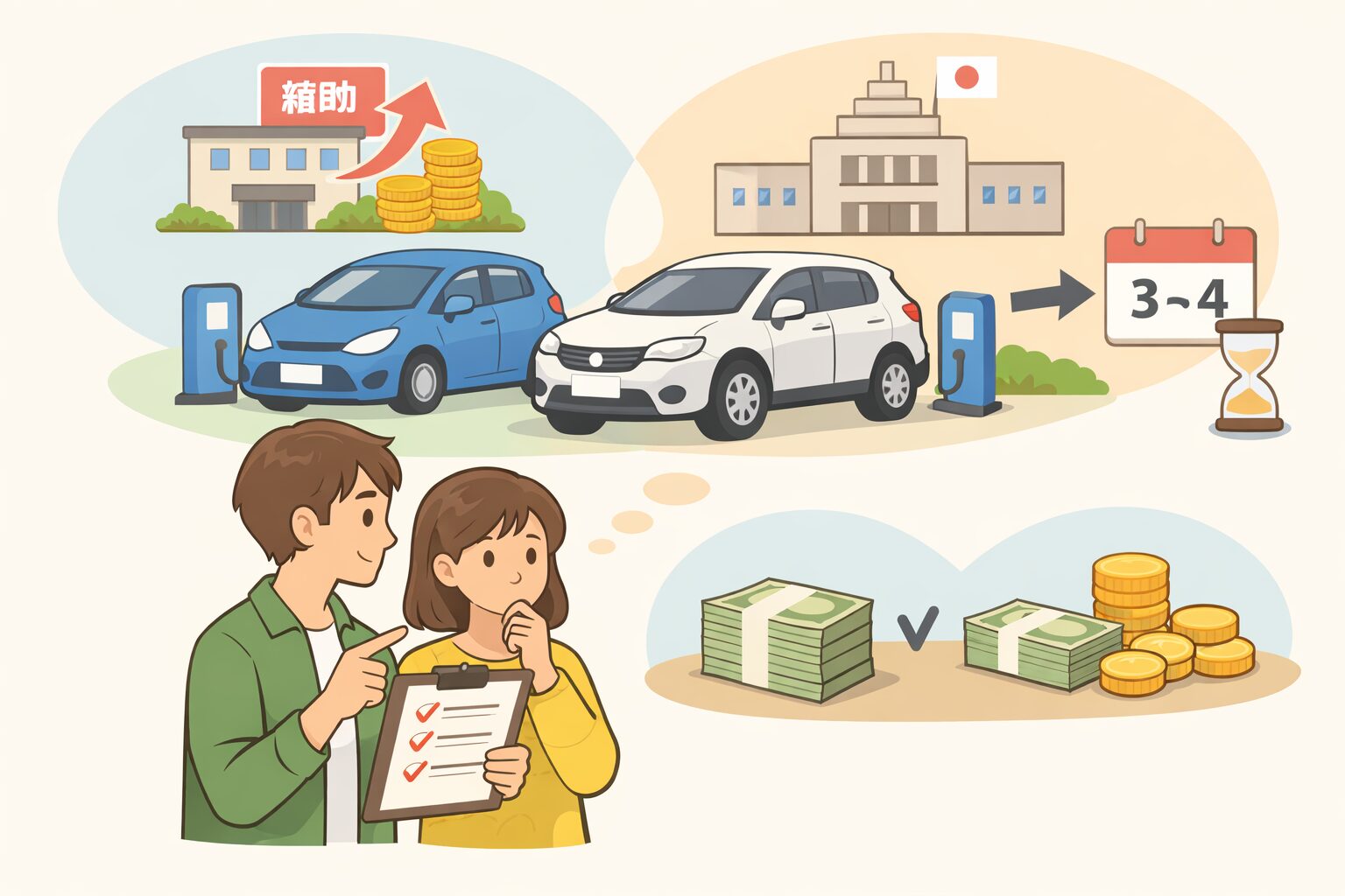 とくに2026年は、東京都のように大きな上乗せがある地域と、国補助のみで考える地域の差が大きい年です。「国補助後の価格」までで一度比較し、そのあと自治体分を足し引きすると、候補車の見え方がかなり整理しやすくなります。